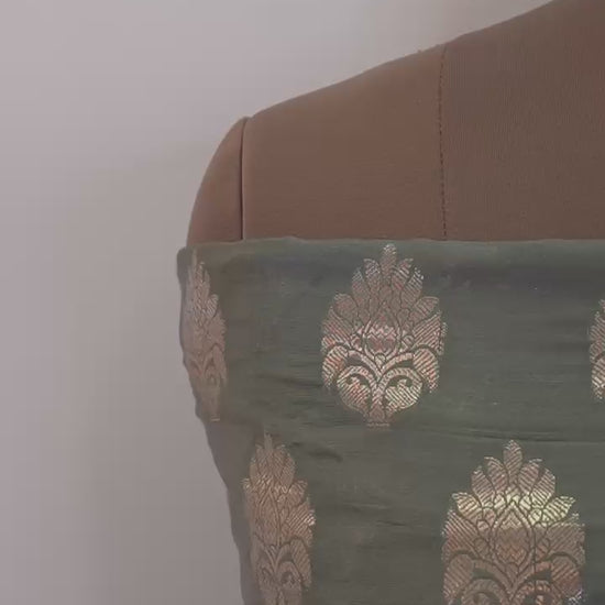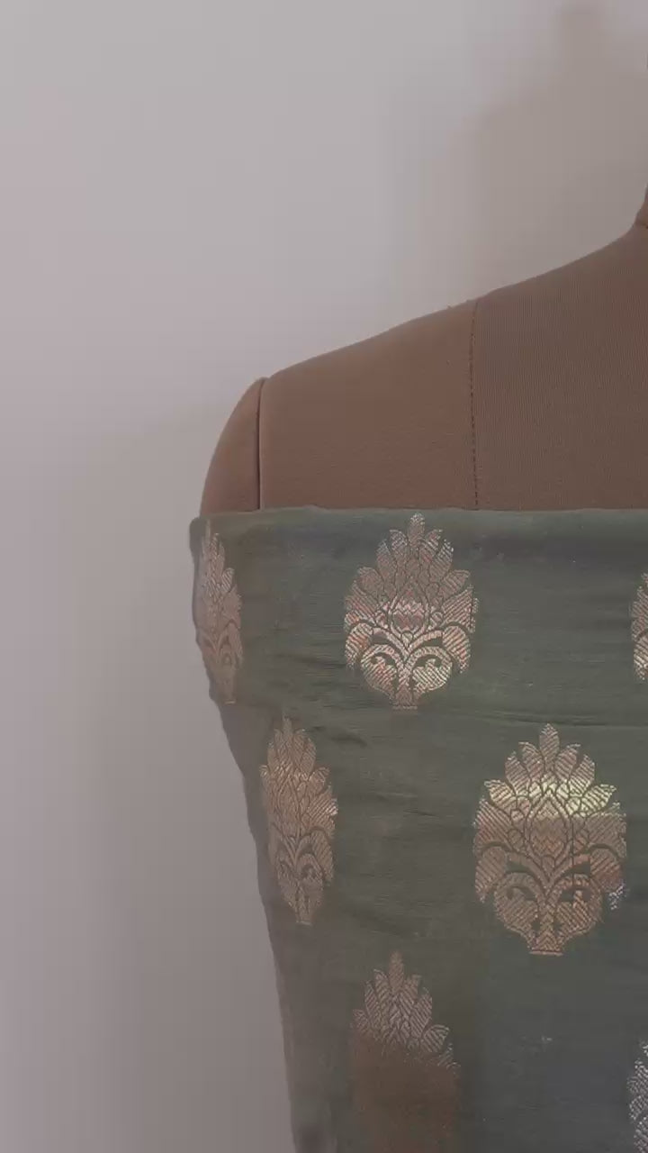 Experience timeless elegance with this Grey Banarasi Chanderi Suit Set crafted with rich zari woven motifs and a luxurious traditional finish. The subtle grey shade combined with metallic zari work creates a graceful and royal look making it perfect for festive occasions cultural gatherings and special celebrations.
